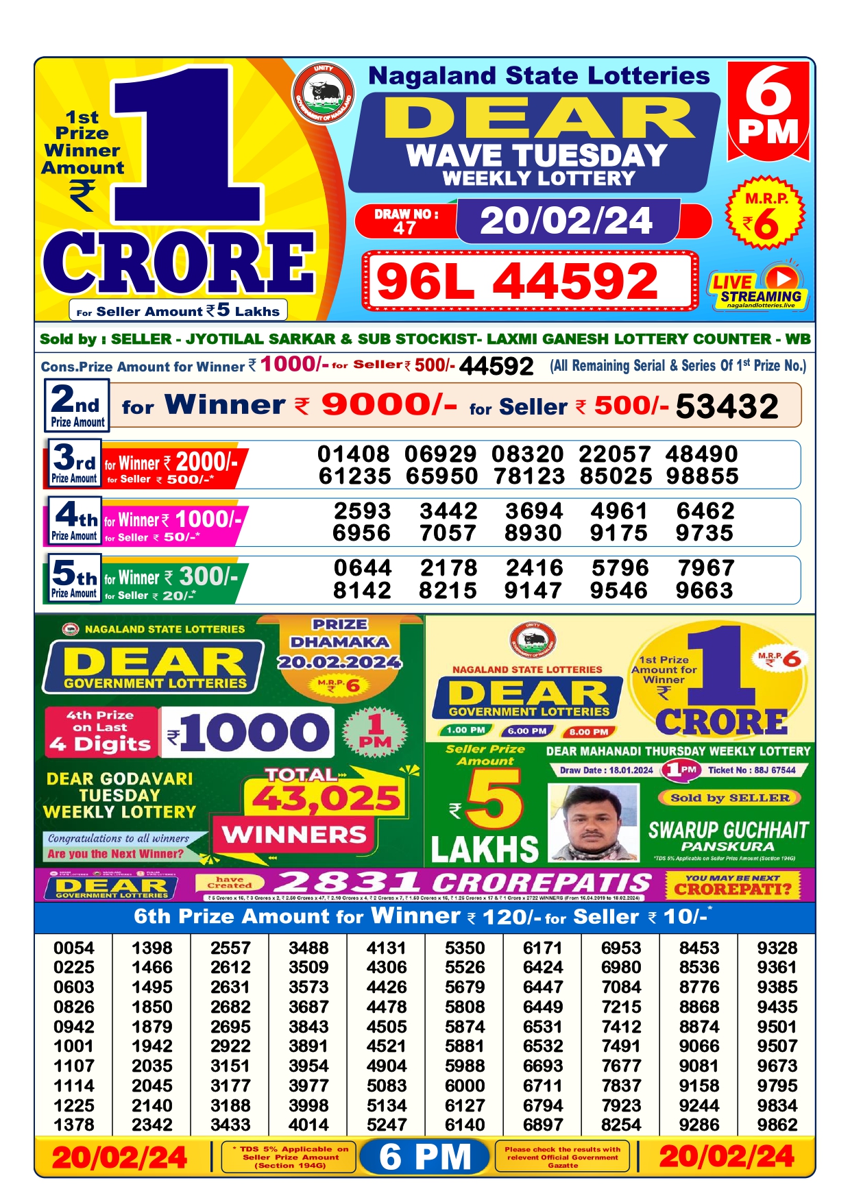 Nagaland State Dear Daily Lottery 20 Feb 2024 6PM Draw Result