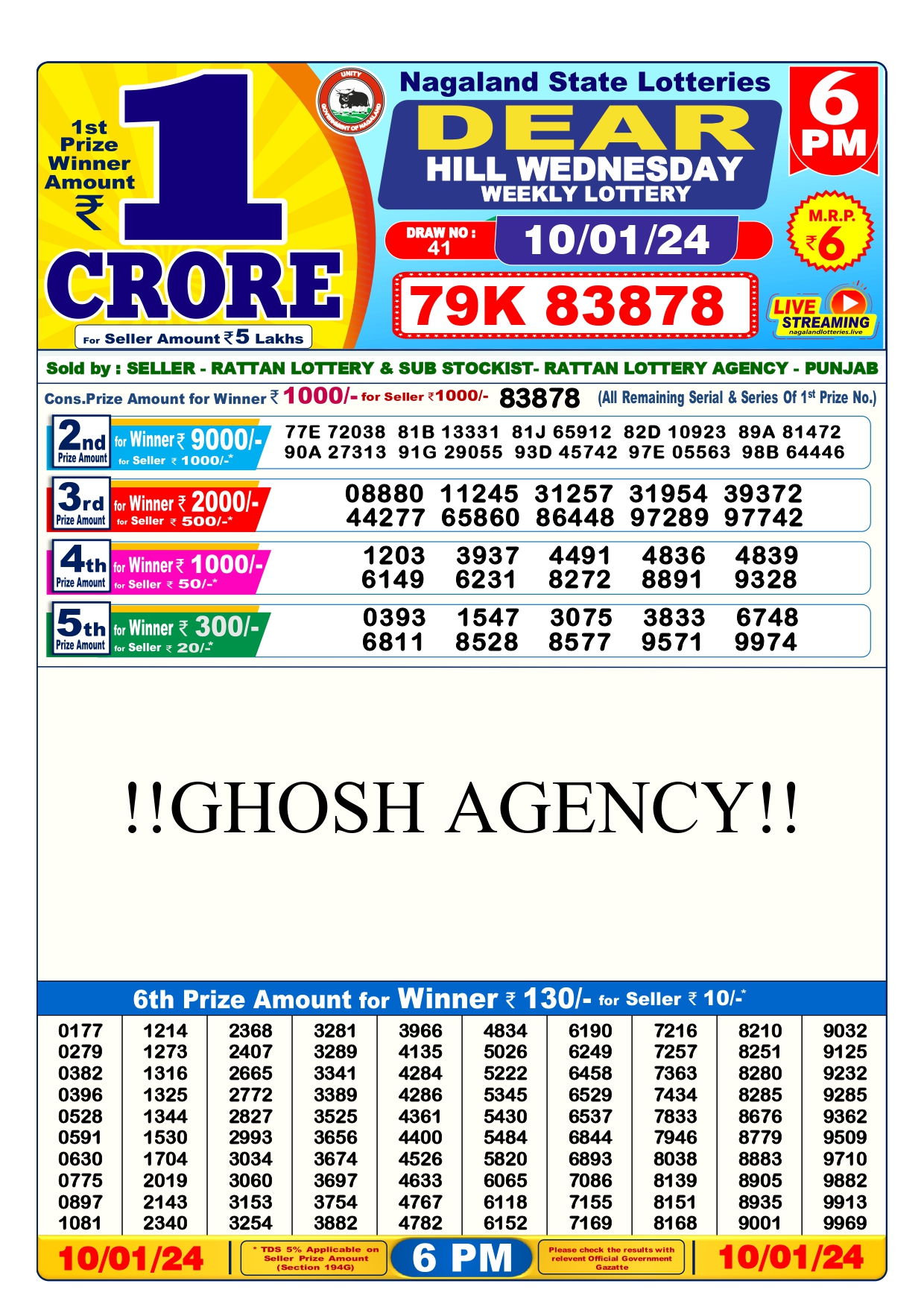 Nagaland State Dear Daily Lottery 9 Jan 2024 6PM Draw Result>>