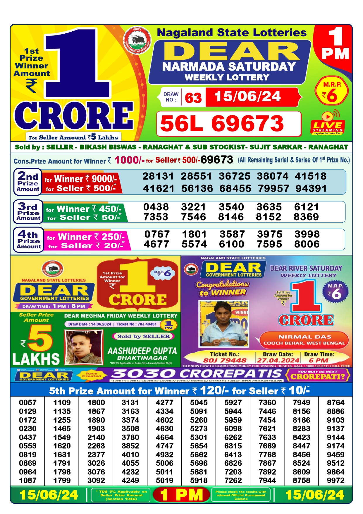 || Nagaland State Dear Daily Lottery :: 17-06-2024 1PM Draw Result ||