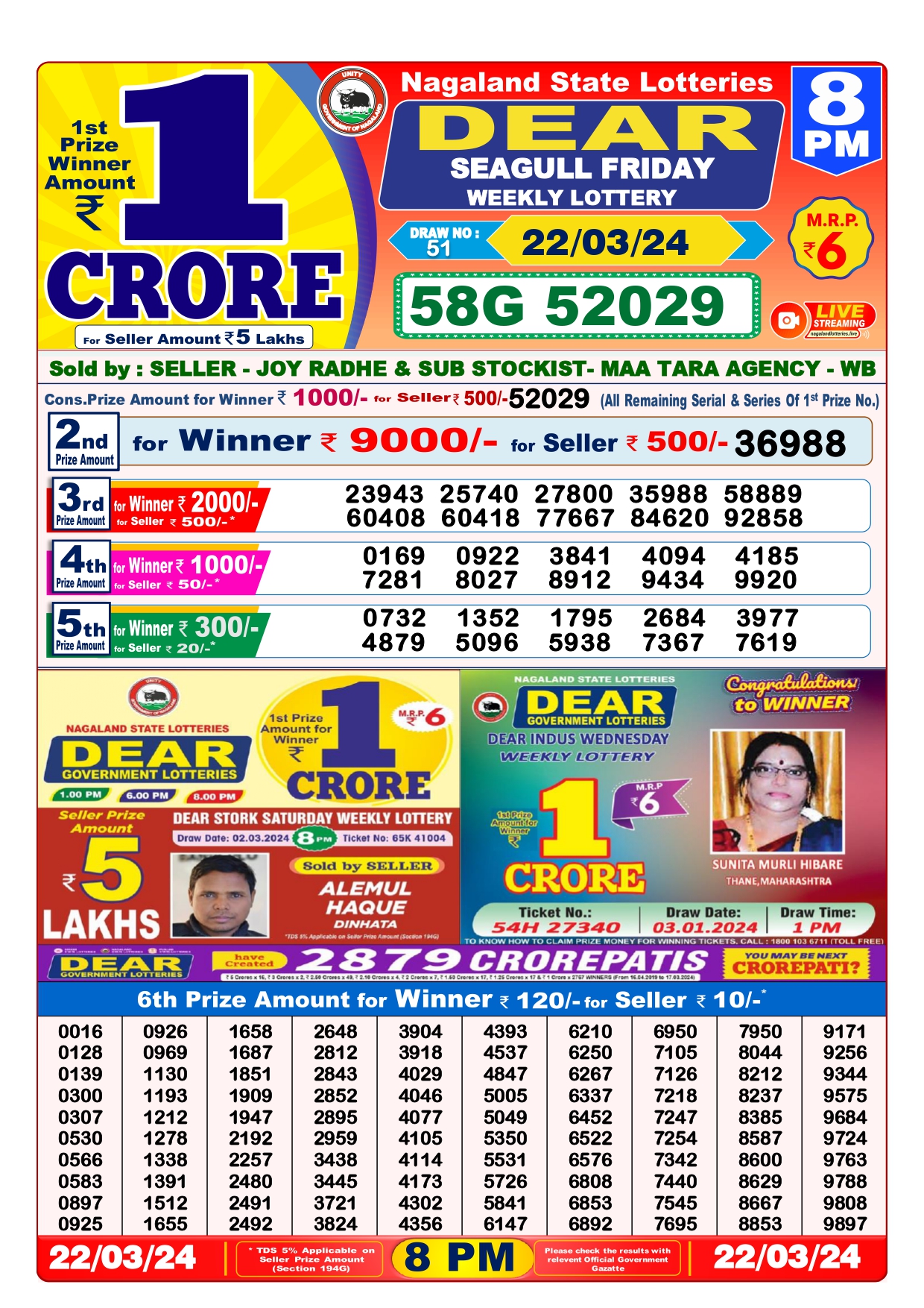 || Nagaland State Dear Daily Lottery :: 22-March-2024 8PM Draw Result ||