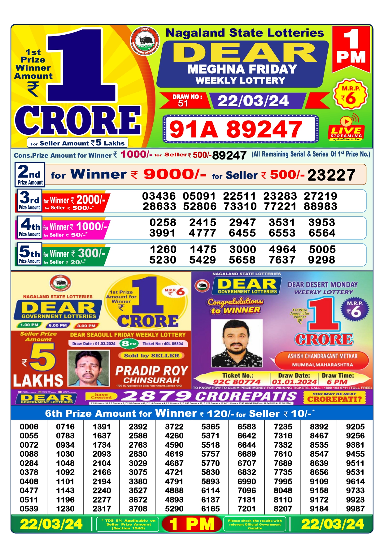 || Nagaland State Dear Daily Lottery :: 22-March-2024 1PM Draw Result ||
