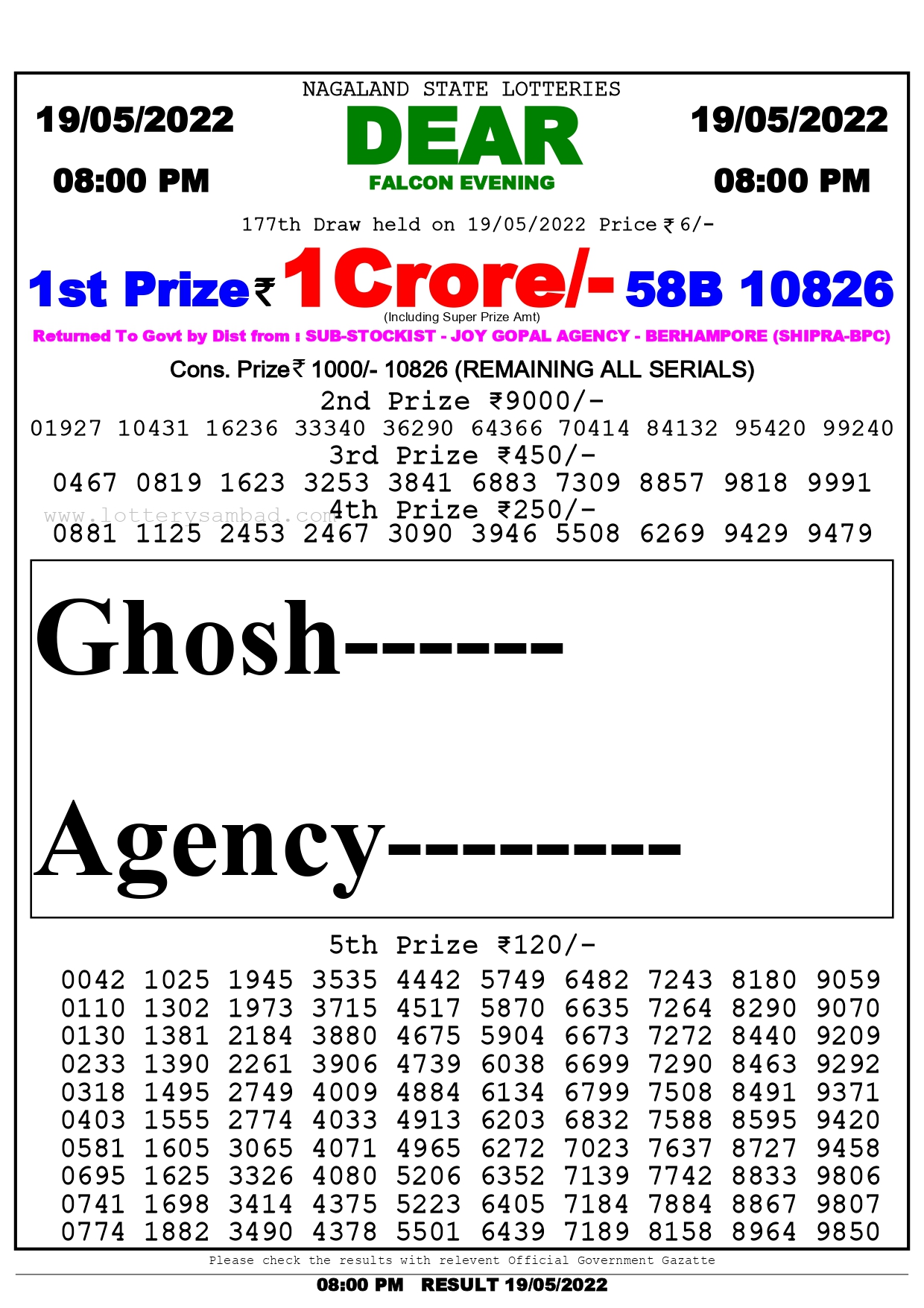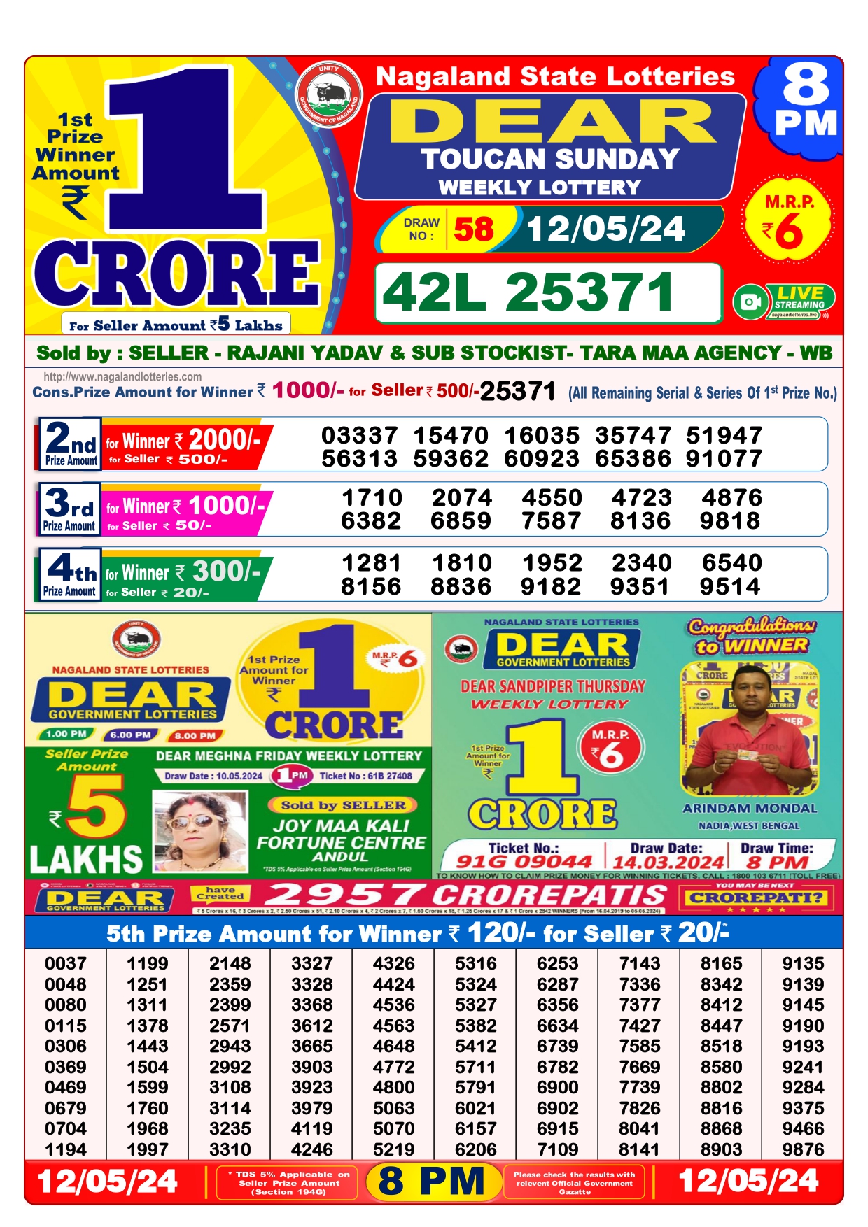 || Nagaland State Dear Daily Lottery :: 12-05-2024 8PM Draw Result ||