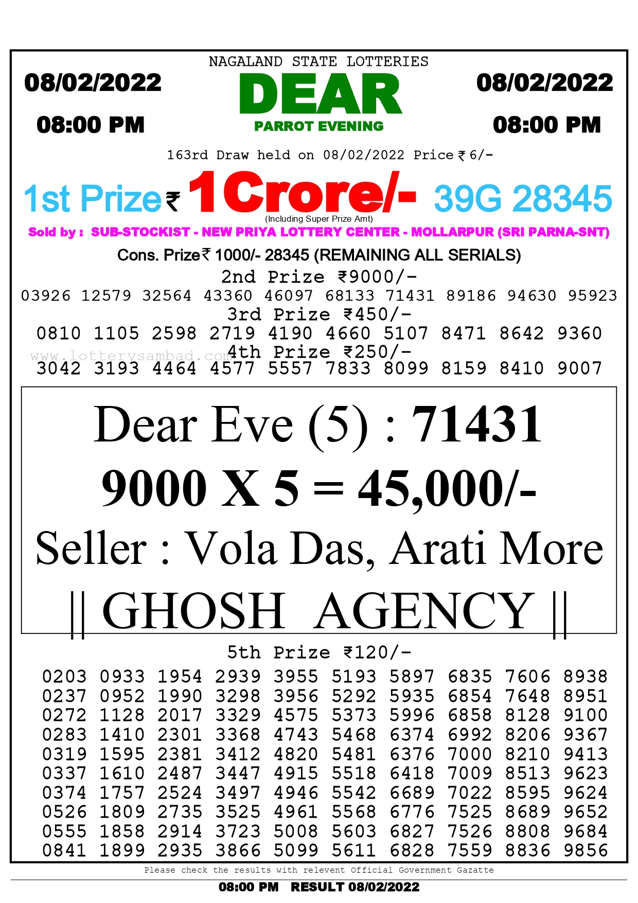 Nagaland State Dear Daily Lottery 8 Feb 2022 8PM Draw Result