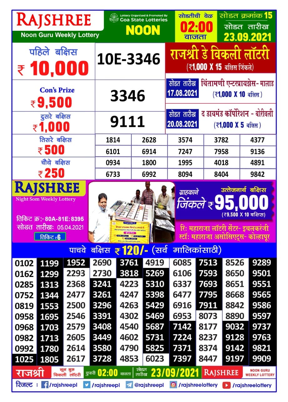 Rajshree Noon Guru Weekly Lottery Result (Marathi) 2 pm 23.09.2021