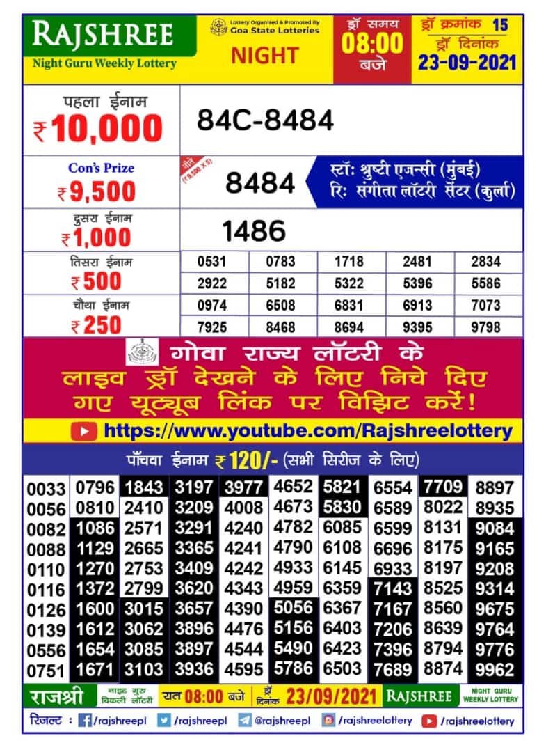 Rajshree Night Guru Weekly Lottery Result ( Marathi ) 8pm 23.09.2021