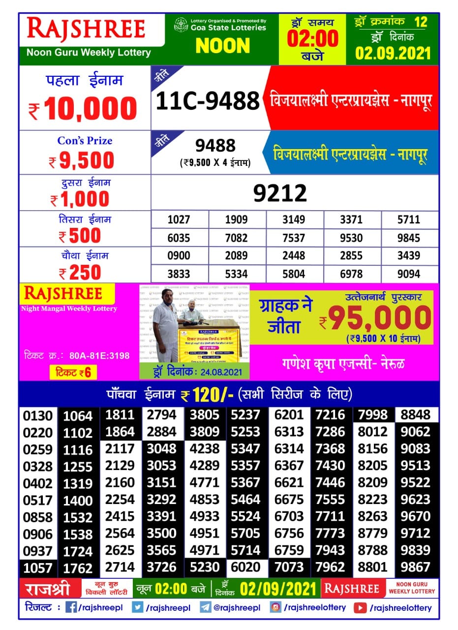 Rajshree Noon Guru Weekly Lottery Result 2 pm 02.09.2021