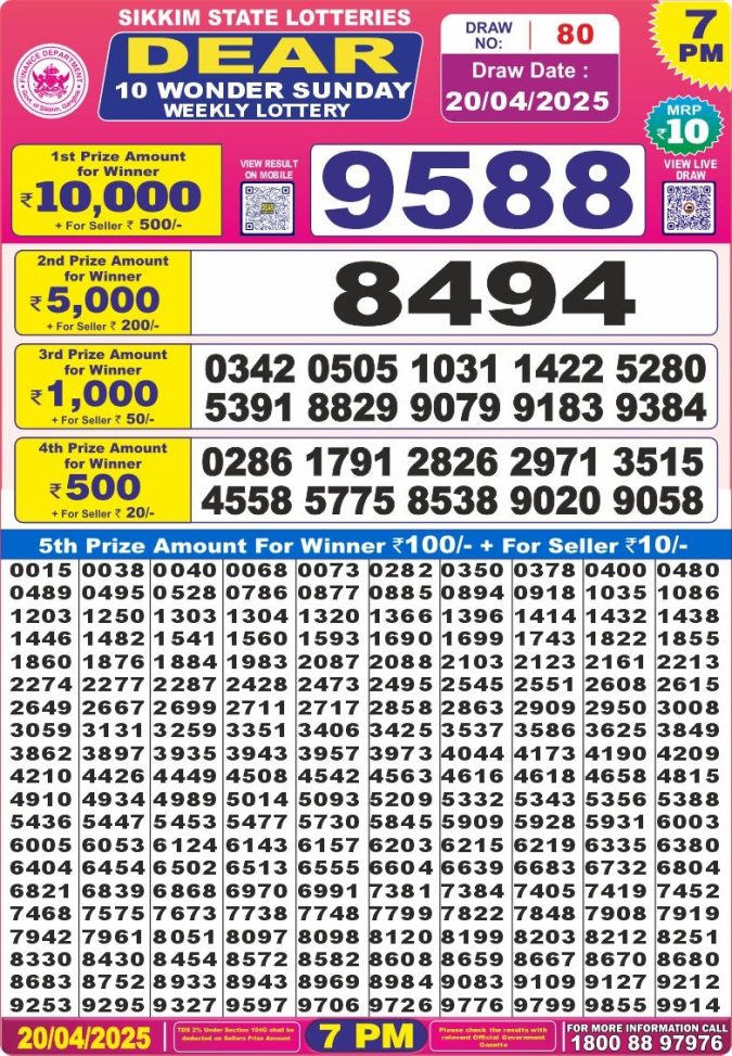 Dear 10 lottery 7 pm result 20.04 2025