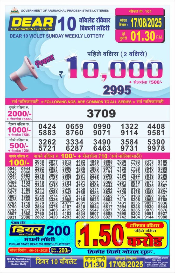 Dear 10 Lottery Result 17.08.25 1:30 PM