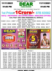 Dear Lottery Nagaland State Lottery Today 1:00 PM 11-11-2021