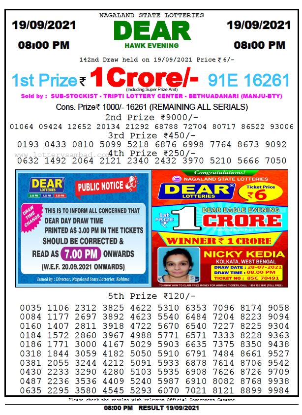 Dear Lottery Nagaland State Lottery Today 8:00 PM 19-09-2021