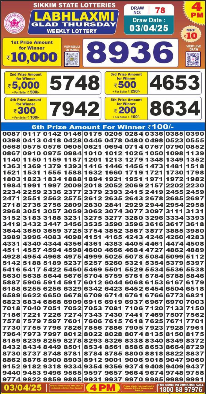 Labh laxmi lottery 4 pm result 3.04 2025