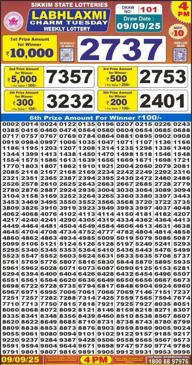 Labh Laxmi Lottery Result Today 09.09.25 4 PM