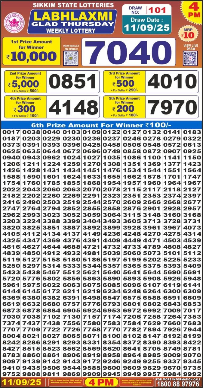 Labh Laxmi Lottery Result Today 11.09.25 4 PM
