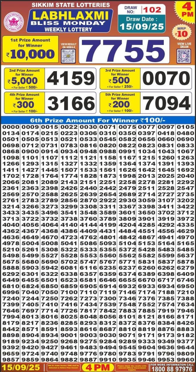 Labh Laxmi Lottery Result Today 15.09.25 4 PM