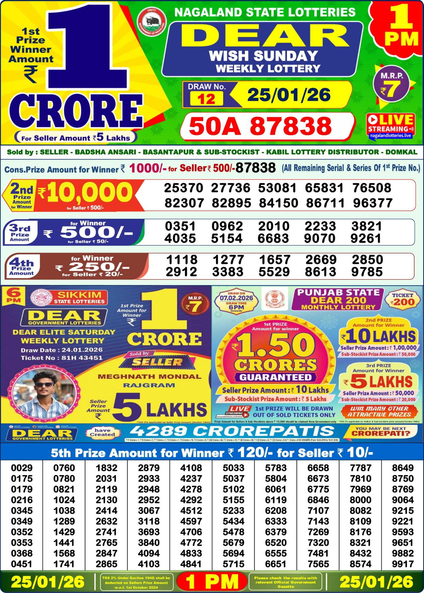The Lottery Sambad Today Dear 1 PM Result (25/01/26), also searched as Dear Lottery Result Today 1 PM, will be declared shortly. Ticket sales are now closed.