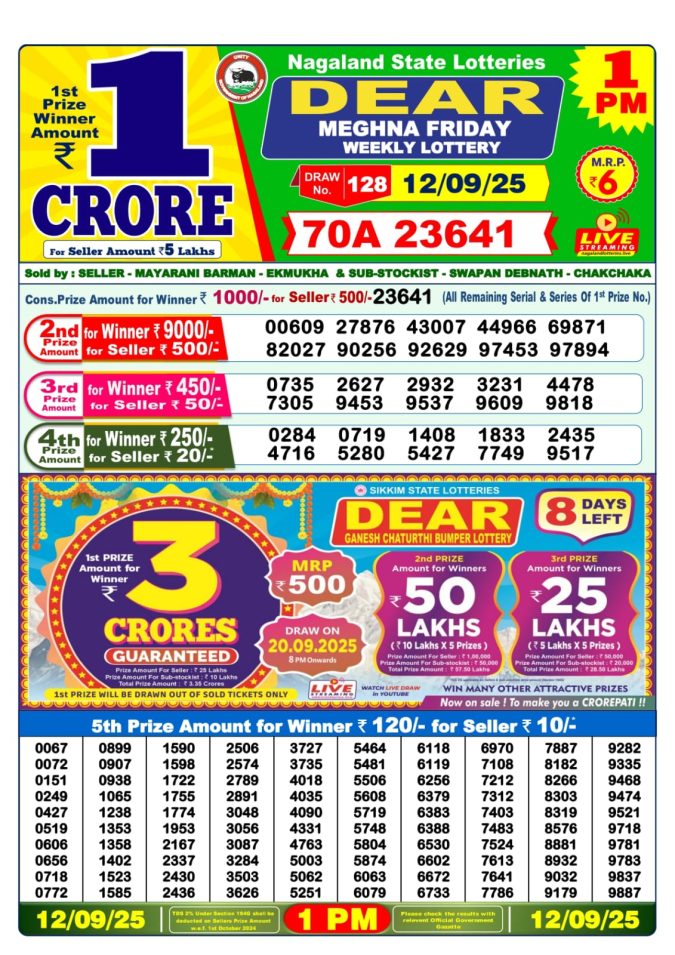 Nagaland Dear Lottery Morning Result 12.09.25 1 PM