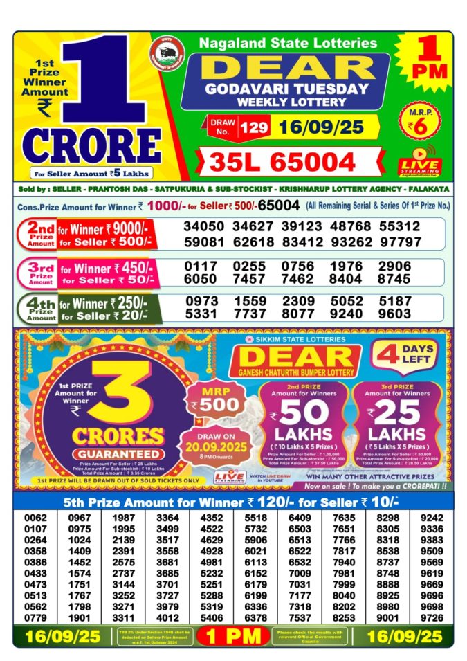 Nagaland Dear Lottery Morning Result 16.09.25 1 PM