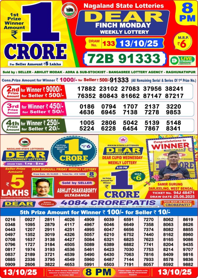 Nagaland Dear Lottery Result Today 13.10.25 8 PM Live