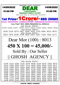 Nagaland State Dear Daily Lottery 14-Sep-2022 1PM Draw Result