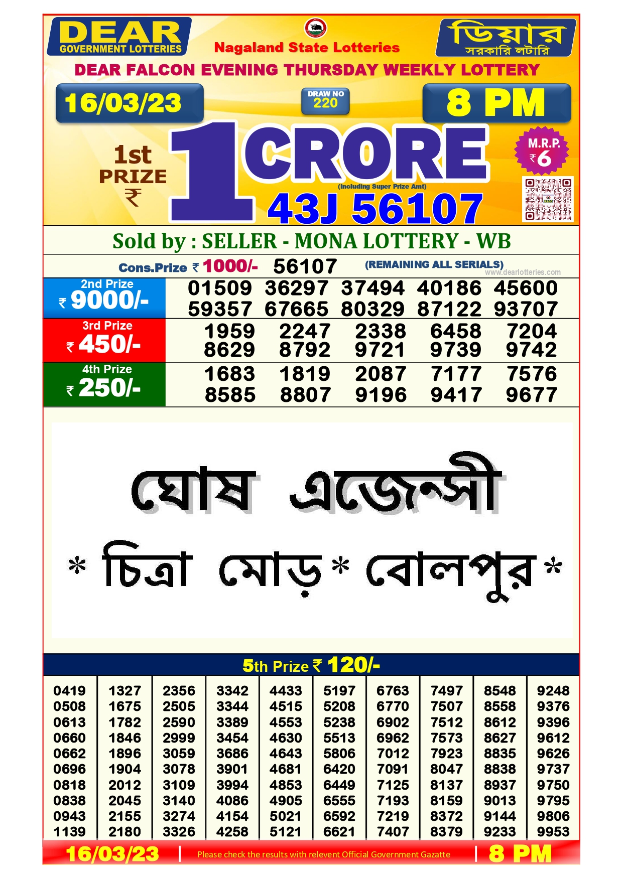 Nagaland State Dear Daily Lottery 16 Mar 2023 6pm Draw Result →