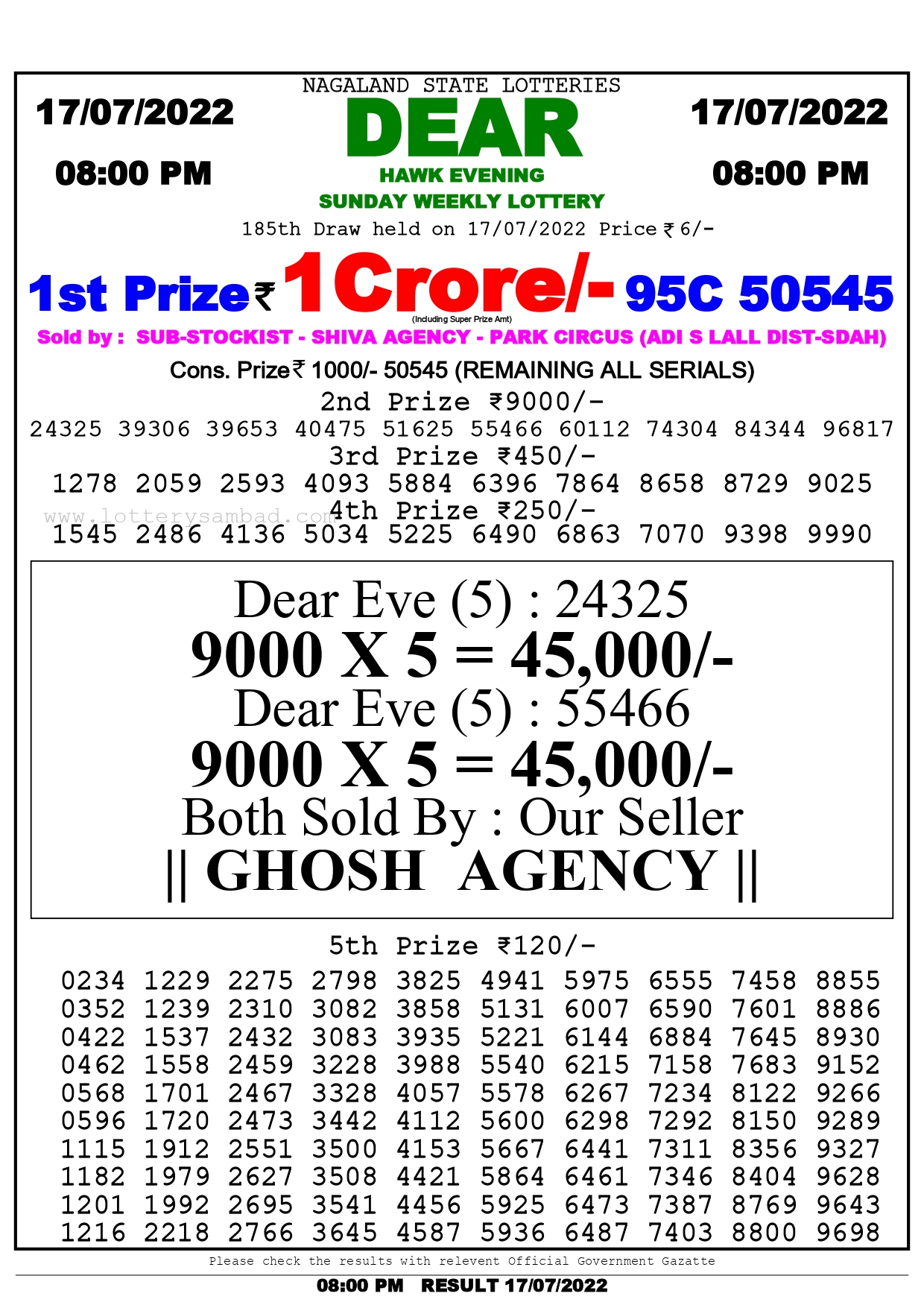 Nagaland State Dear Daily Lottery 17-July-2022 8PM Draw Result