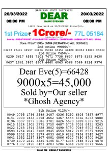 Nagaland State Dear Daily Lottery 20 March 2022 8pm Draw Result