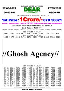 Nagaland State Dear Daily Lottery 27May 2022 1PM Draw Result →