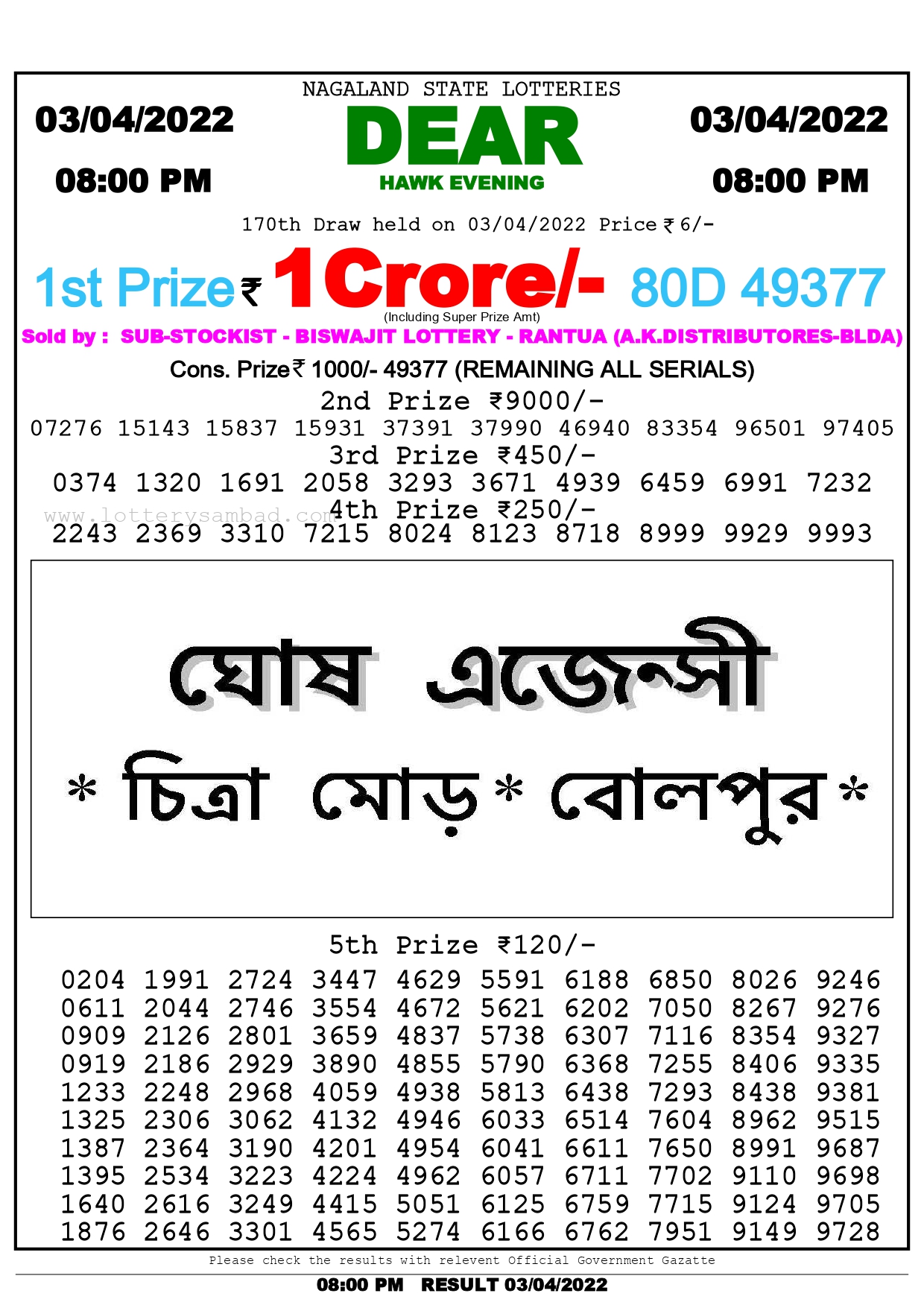 Nagaland State Dear Daily Lottery 3 April 2022 6PM Draw Result →