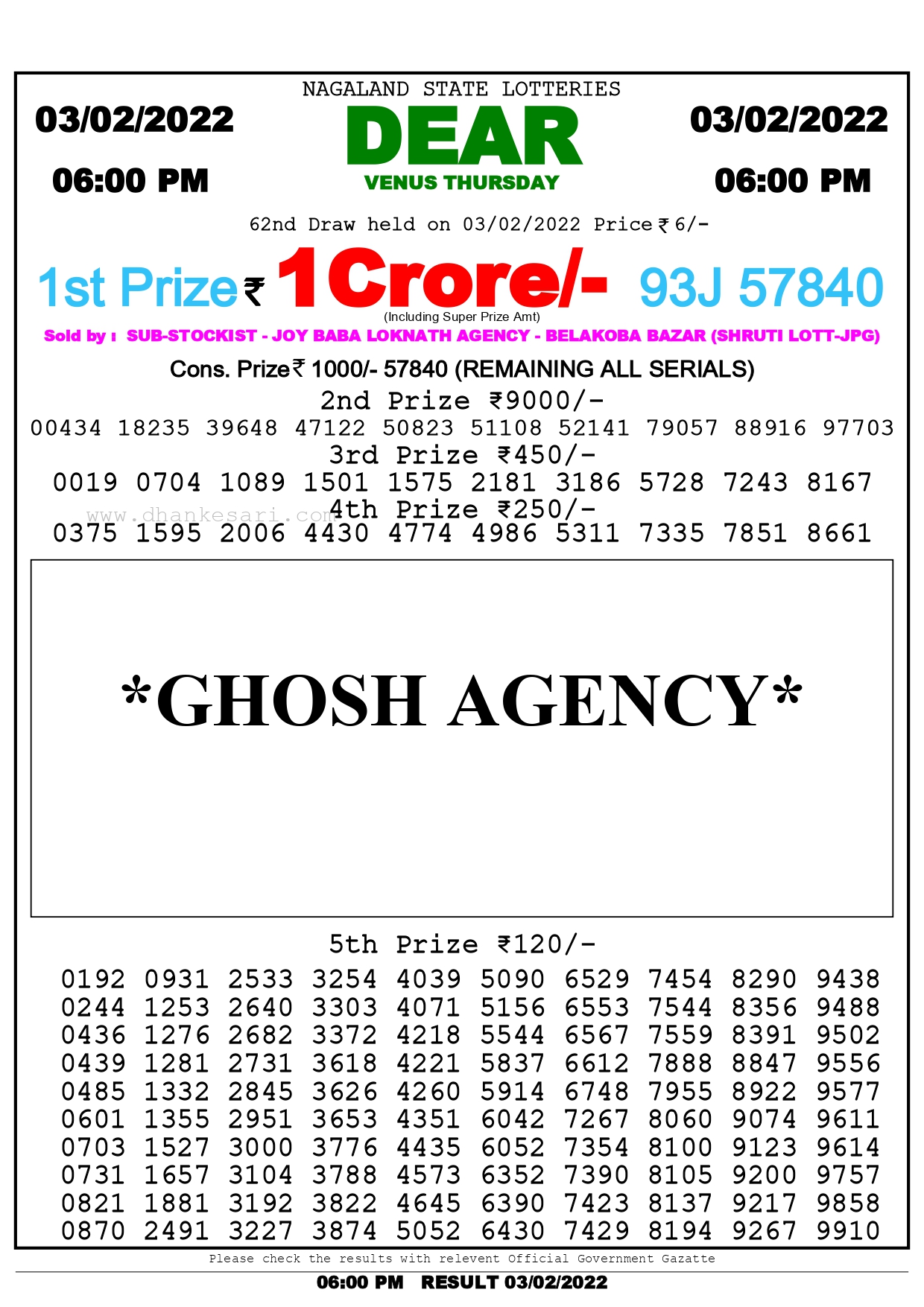 Nagaland State Dear Daily Lottery 3 Feb 2022 6Pm Draw Result