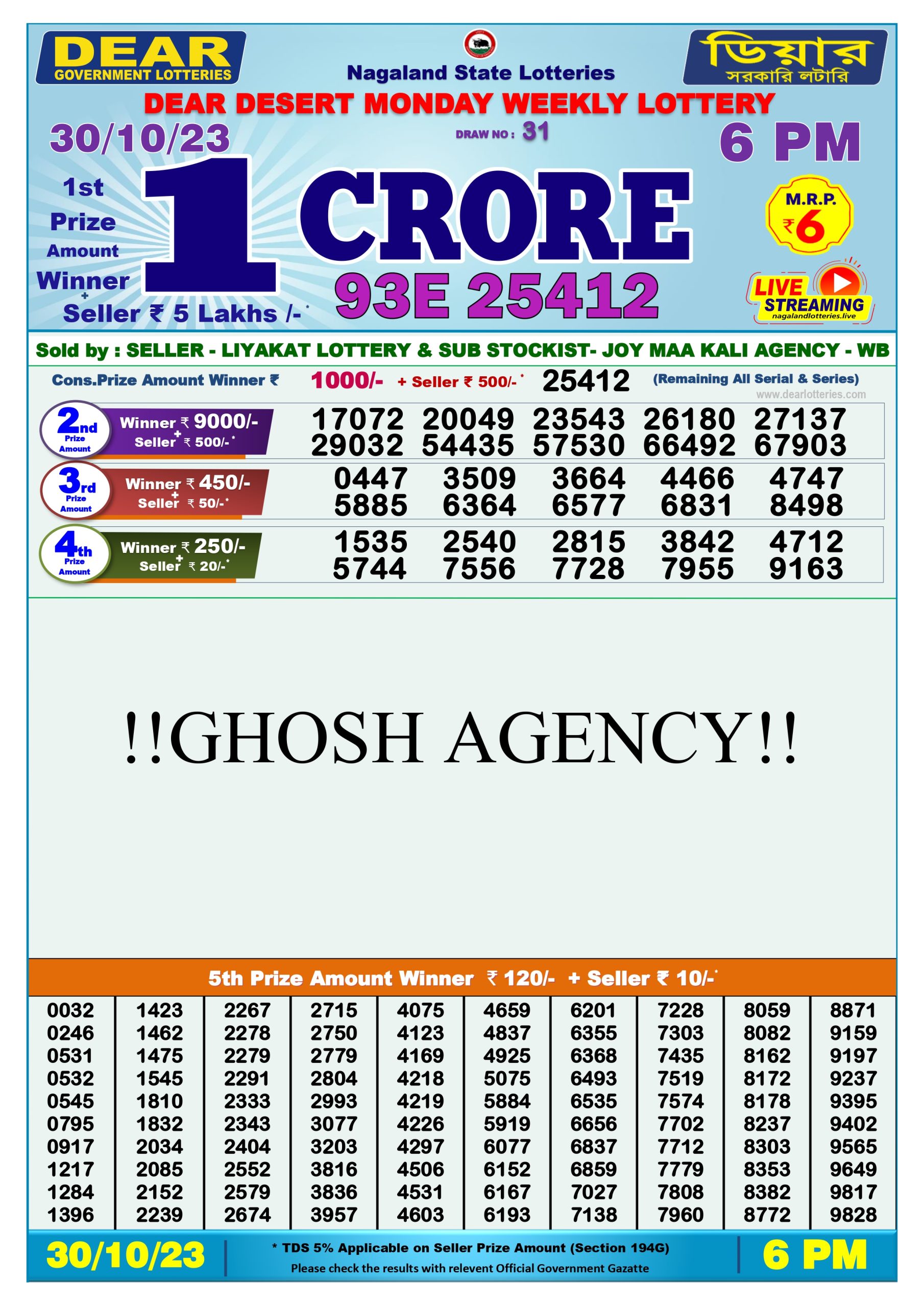 Nagaland State Dear Daily Lottery 30-Oct-2023 6PM Draw Result