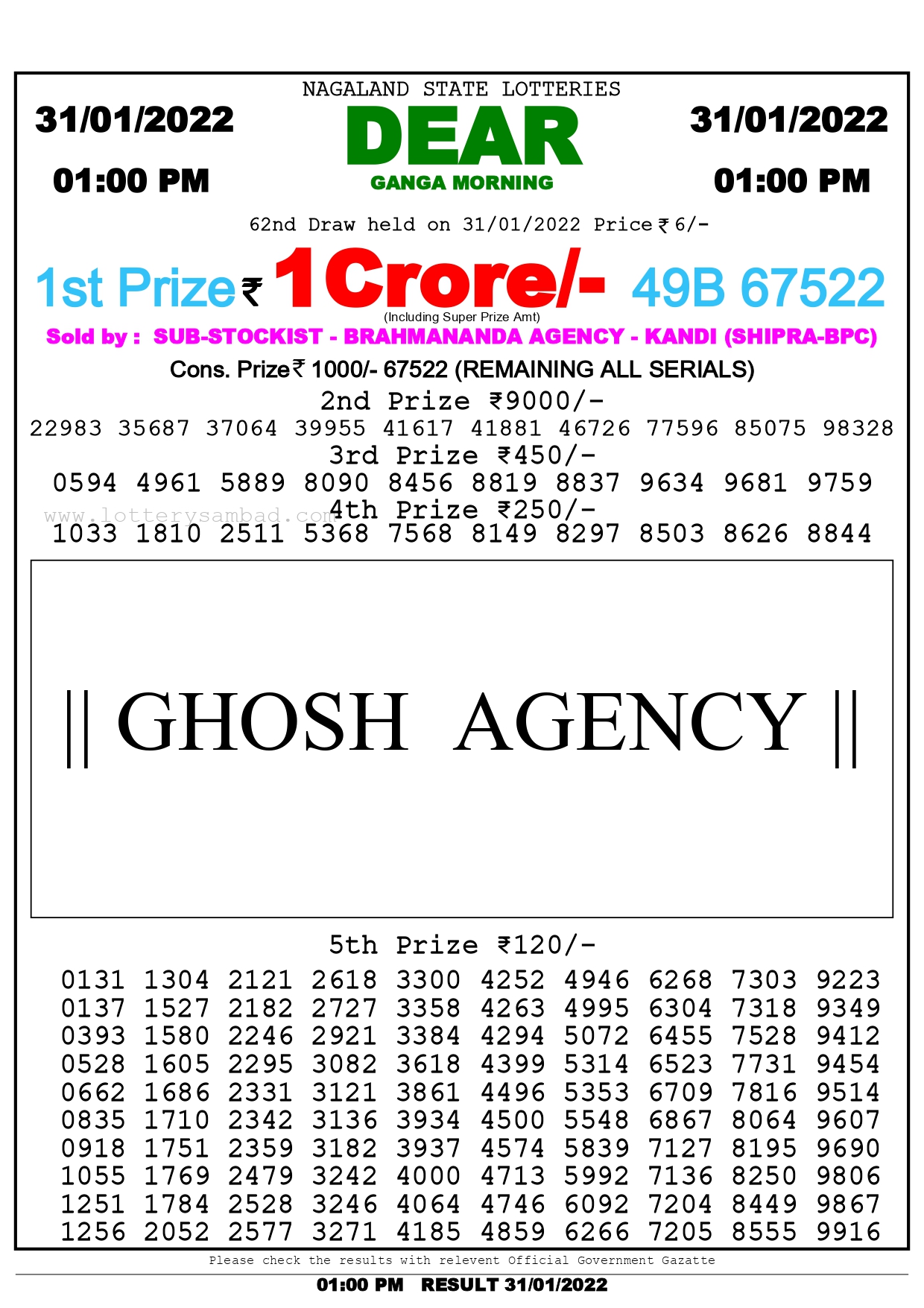 Nagaland State Dear Daily Lottery 31 Jan 2022 1PM Draw Result