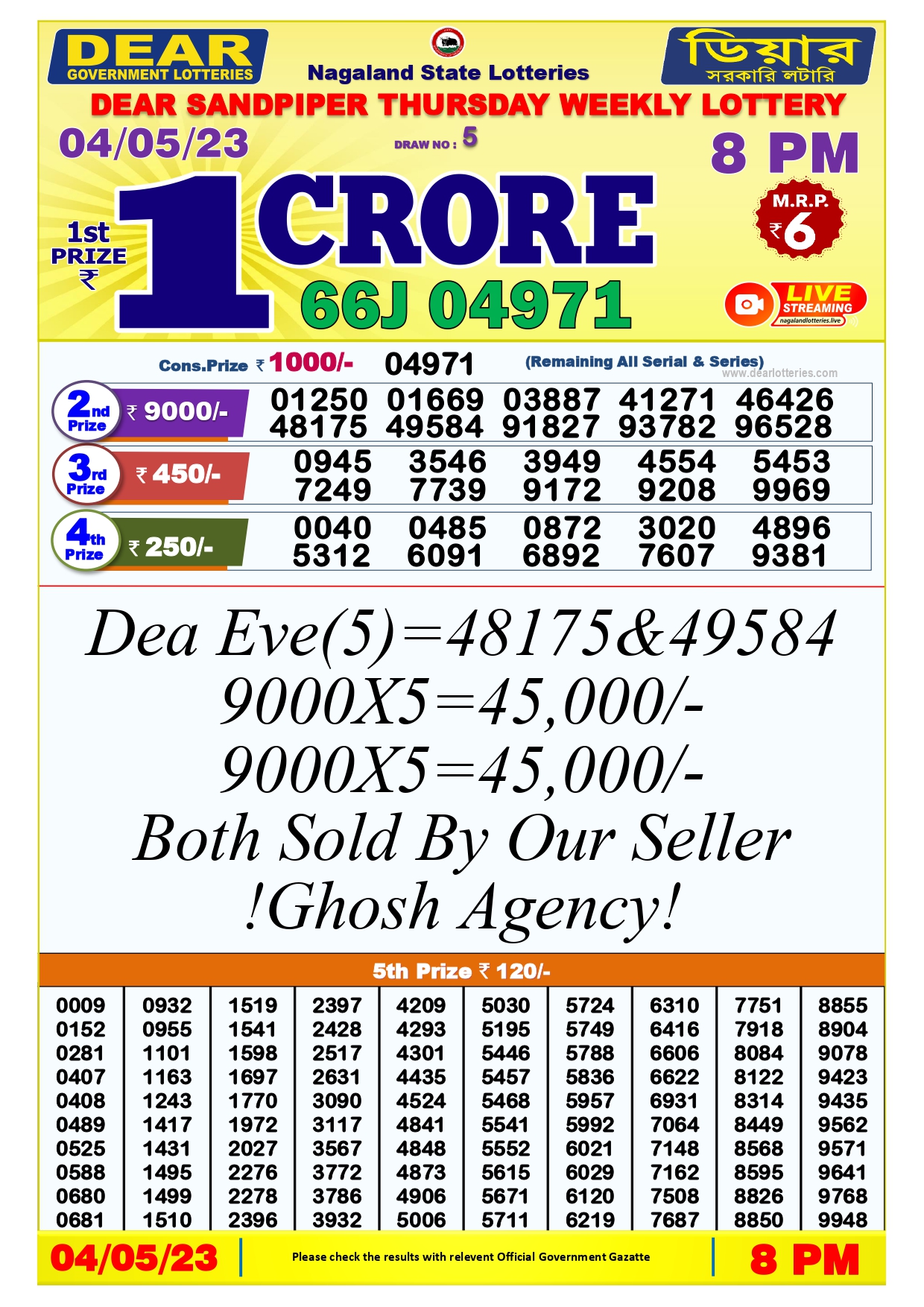 Nagaland State Dear Daily Lottery 4 May 2023 8pm Draw Result