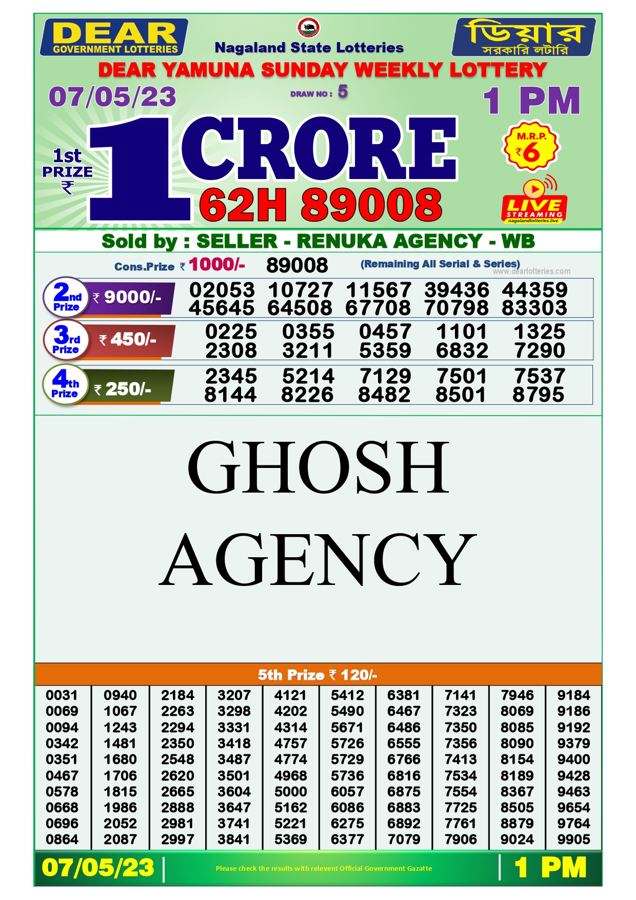 Nagaland State Dear Daily Lottery 7 May 2023 1pm Draw Result