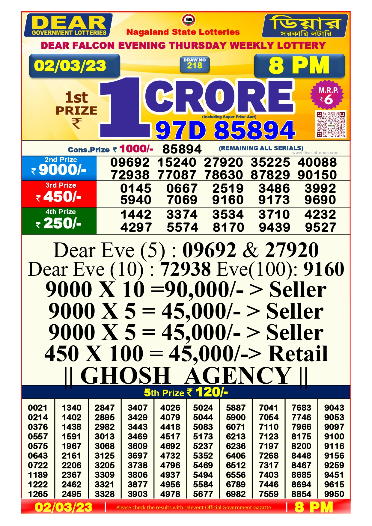 Nagaland State Dear Lottery 02-March-2023 8PM Draw Result