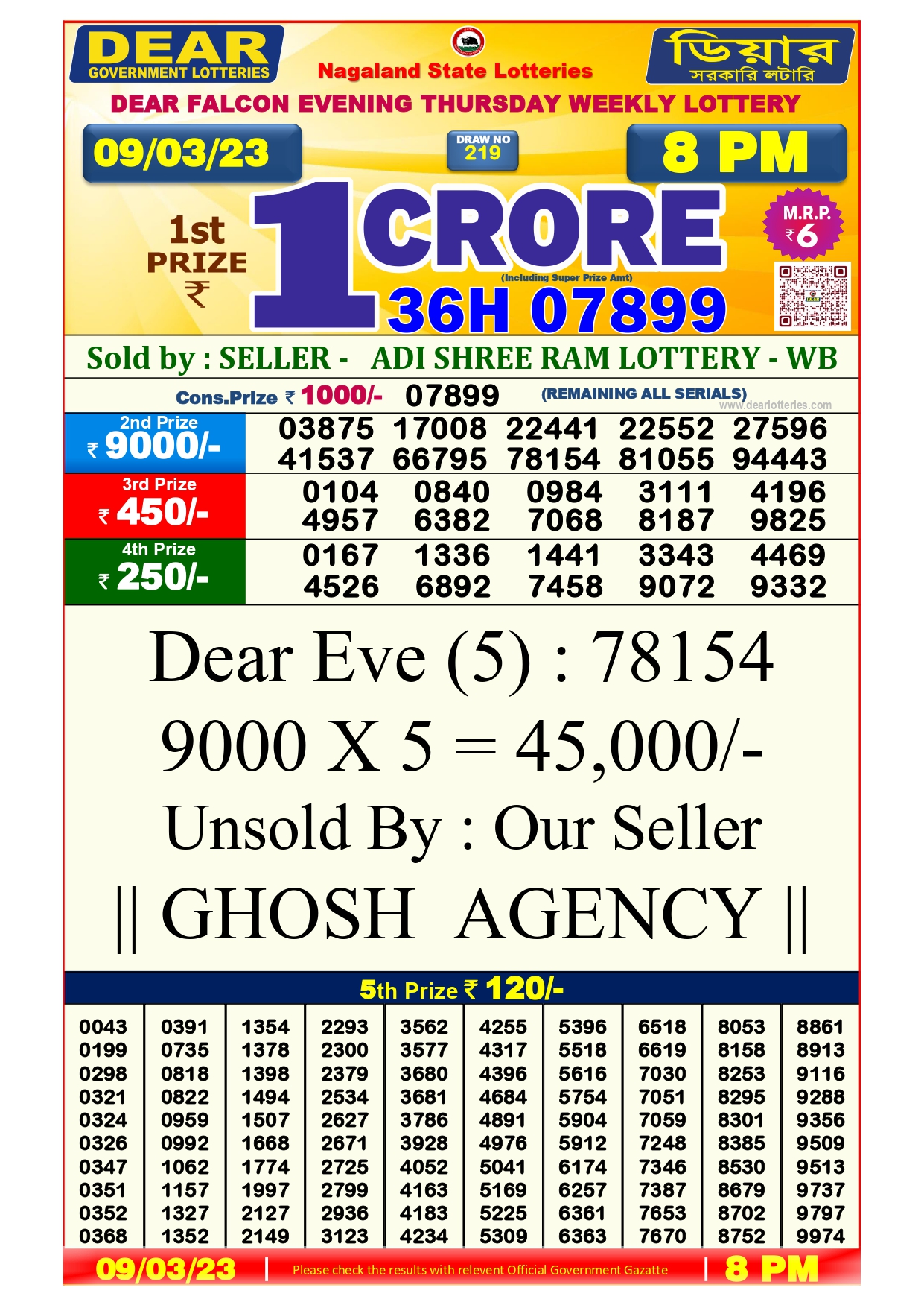 Nagaland State Dear Lottery 09-March-2023 8PM Draw Result