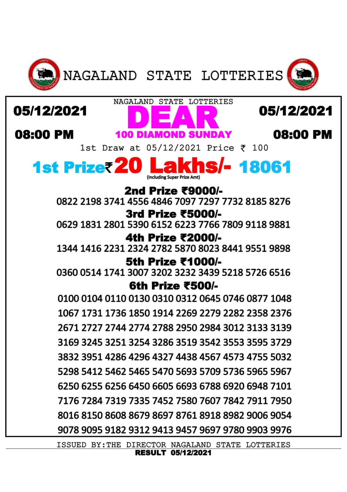 NAGALLAND STATE DEAR 100 SUPER WEEKLY LOTTERY 8 pm 05.12.2021