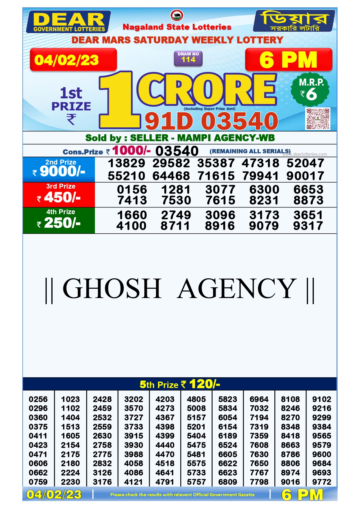 Nahgaland State Dear Daily Lottery 04-Feb-2023 6PM Draw Result