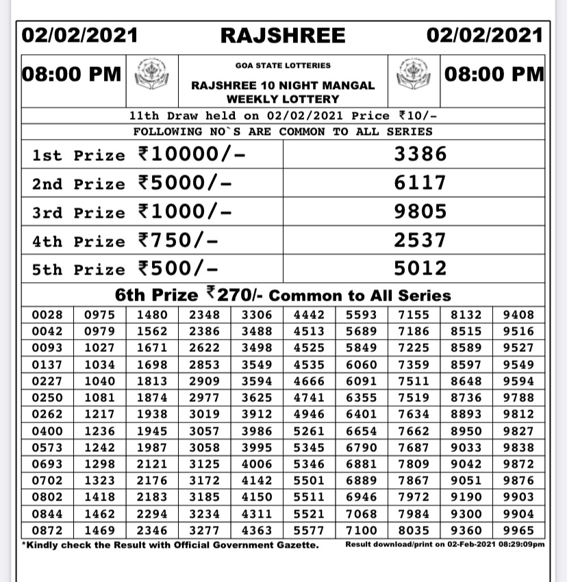 RAJSHREE10 NIGHT 8:00 PM LOTTERY RESULTS 02.2.2021