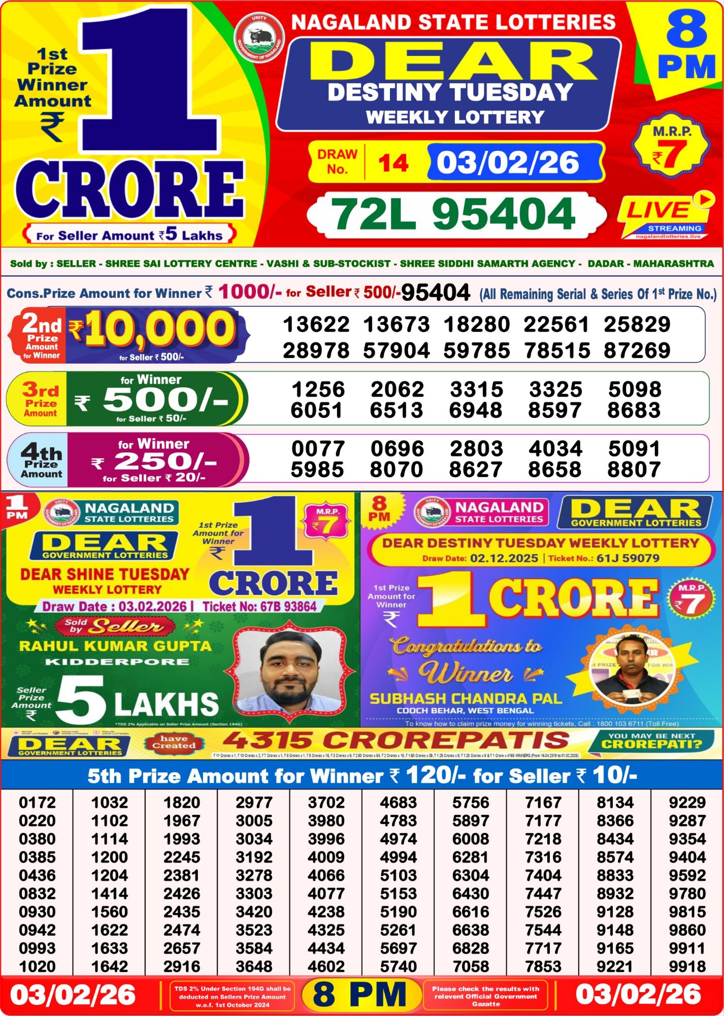 All results for today are now complete after the 03/02/26 8PM Nagaland State Lottery Result.