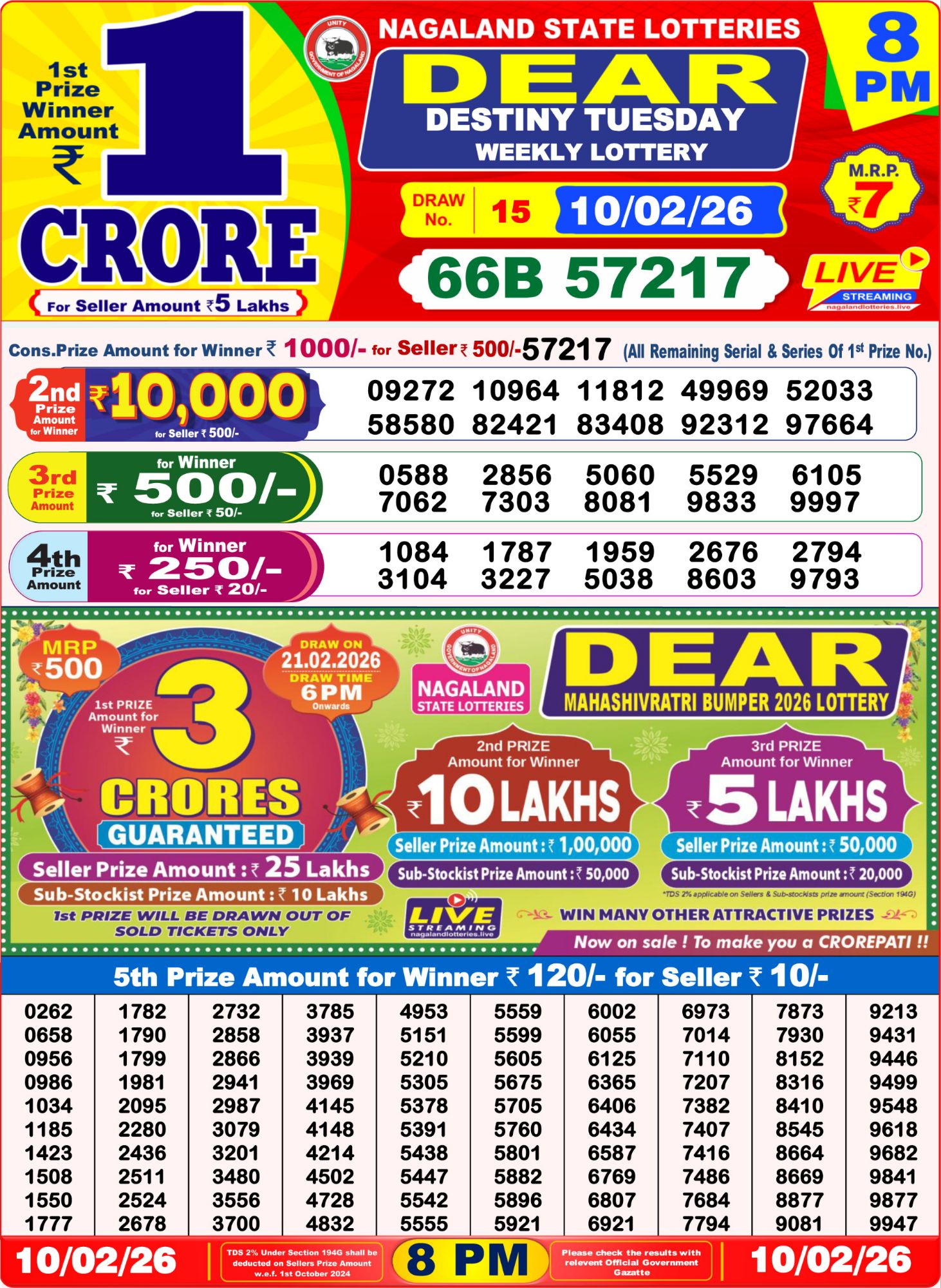 All results for today are now complete after the 10/02/26 8PM Nagaland State Lottery Result.