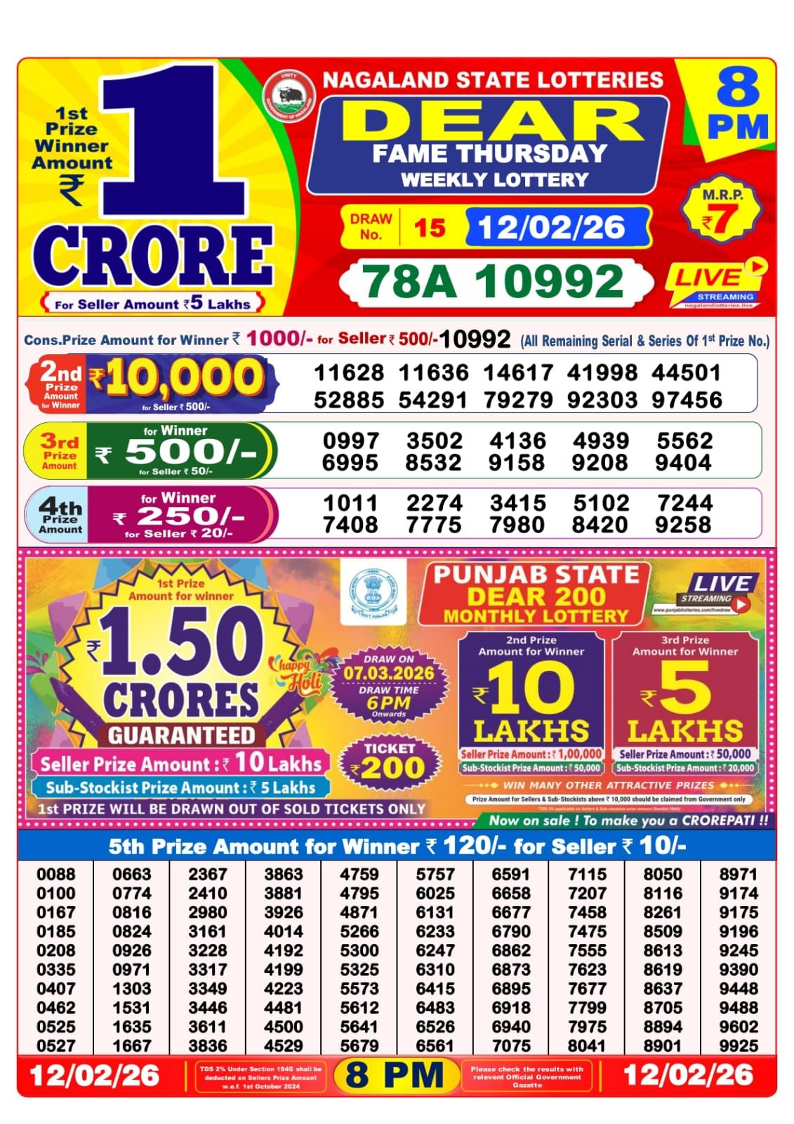 All results for today are now complete after the 12/02/26 8PM Nagaland State Lottery Result.